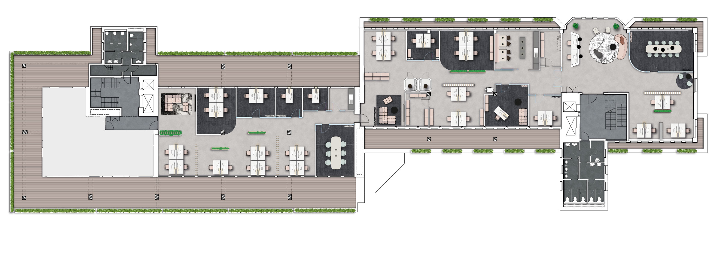 Um dem Gebäude einen neuen Glanz zu verleihen, werden Bereiche bereits 2023 umfassend saniert. So werden Fenster, die Gebäudetechnik und die Mietflächen vollständig erneuert und durch elegante Elemente im Industriestil auf ein neues Level gehoben.
